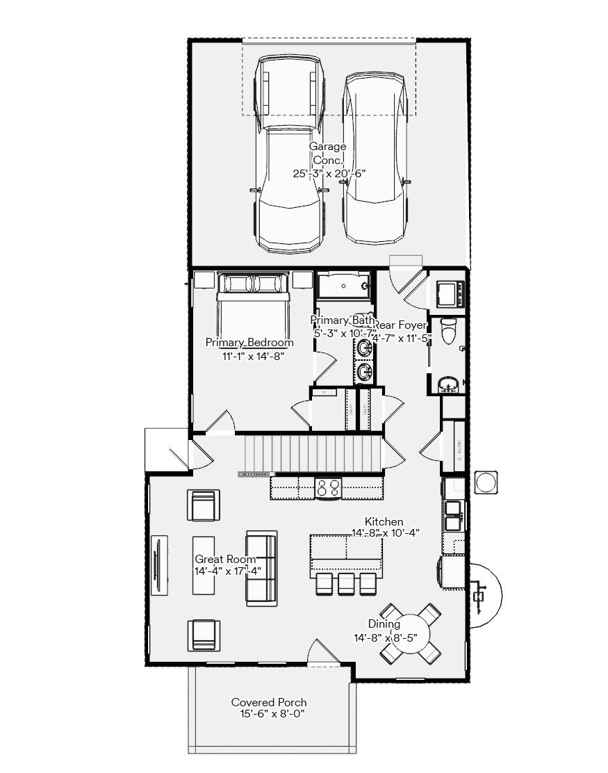 The first-floor Primary Bedroom offers comfortable privacy just steps away from the main living areas. A rear foyer off the kitchen leads to the garage, located at the back of the home, keeping the front of the home clean and welcoming.