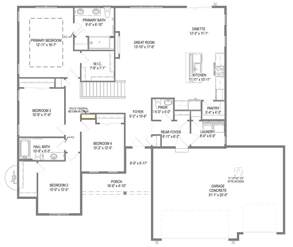 The Holly is a ranch design with all bedrooms located on the same side of the home. The entryway features an open Front Foyer and Flex Room with a unique angled entry. Across from the Flex Room is a Rear Foyer, which has a Powder Room, linen closet, and Laundry Room. Just past the stairs to the lower level, the floor plan opens to the main living space with the Great Room, Dinette, and Kitchen with a corner walk-in pantry. The two secondary bedrooms on the opposite side of the home share a full bathroom, while the private Owner’s Suite is highlighted by a large Owner’s bath and walk-in shower.