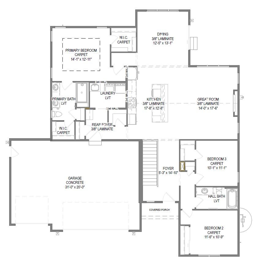 The Lavender is a thoughtfully designed ranch plan that combines efficiency with charm. Upon entering through the front foyer, you'll immediately notice a dedicated hallway leading to two well-sized secondary bedrooms, offering privacy and comfort. The Lavender's main living area boasts an L-shaped design that's perfect for family time and hosting friends. The kitchen is a standout feature, providing not only ample storage but also a sweeping view of both the great room and the backyard, courtesy of the dinette's large windows. This setup ensures you're never far from the action, whether you're cooking or simply enjoying the view. Tucked away through a private hallway off the dinette is the Primary bedroom, a true retreat within the home. It's thoughtfully laid out with two walk-in closets and an adjoining Primary bathroom, creating a personal haven that's both spacious and functional. The rear foyer, likely to be your most-used entry point, is designed with everyday life in mind. It offers ample space, including an optional drop zone for added convenience. This area also features a sizeable laundry room and direct access to the pantry, streamlining daily tasks and keeping your living spaces clutter-free. In every aspect, The Lavender is designed to make life more comfortable, efficient, and enjoyable, making it an ideal choice for those seeking a blend of style and practicality in their home.